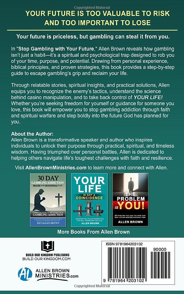 Are you or someone you love struggling with a gambling addiction? Stop Gambling With Your Future is a powerful guide that combines faith, personal experience, and practical strategies to help you break free from the devastating grip of gambling. Written by Allen Brown, a man who overcame his own four-year battle with addiction, this book offers hope, healing, and a path to reclaiming your life.